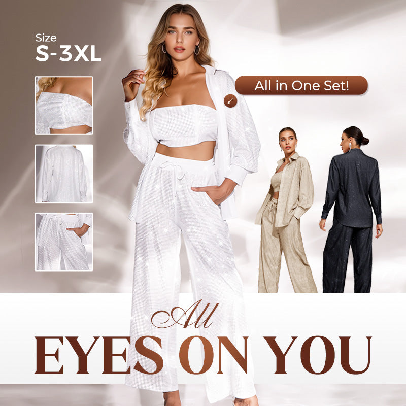 ✨ Blazer a paillette e pantaloni larghi per donne (set in 3 parti)